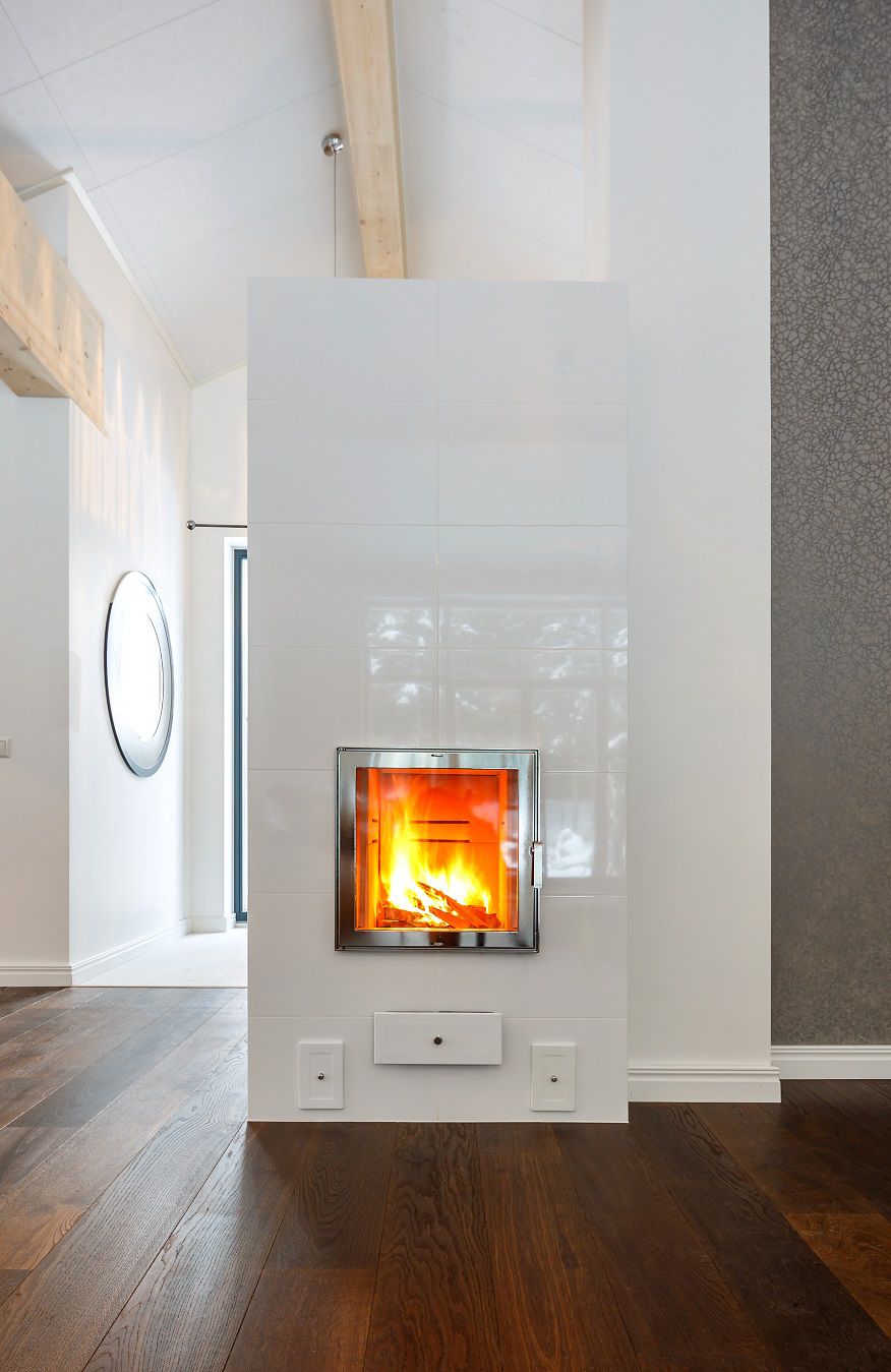 Claudia XL is a classic fireplace with a large and stylish steel and glass door. Claudia is finished with a white ceramic tile. It is possible to choose another tile among many different shades.