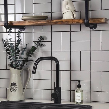 Moderne köögi tagasein valge metrooplaadiga plaaditud kaunis geomeetrilises mustris. Mustad vuugivahed on sobitatud musta sanitaartehnikaga ning mööbli detailidega.