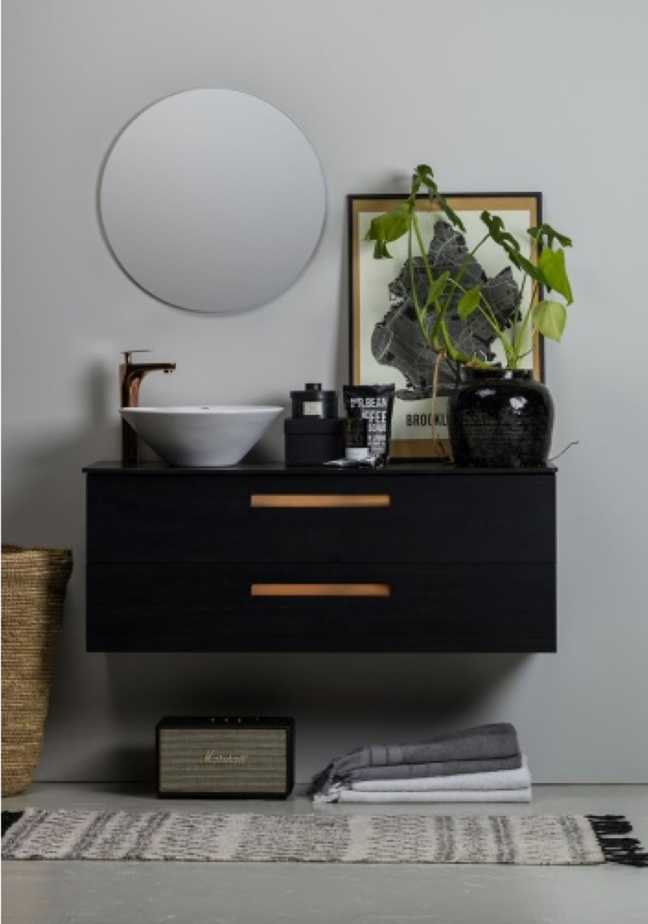 Mugav ja praktiline valamukapp trendika kontrastiga. Messingust detailid on trendikad, silmapaistvad ning lisavad elegantsust.