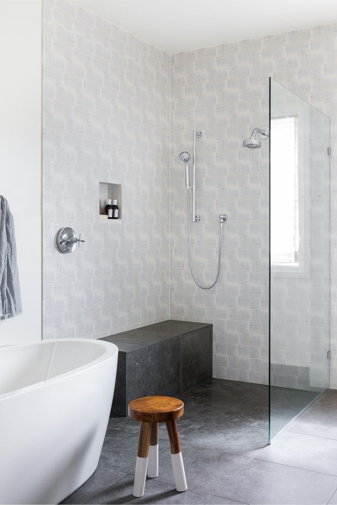 Skandinaaviast inspireeritud avatud walk-in dušš koos sisseehitatud istmega ja mugava vanniga. Väikesed ruudukujulised plaadid tekstiili immitatsiooniga on paigutatud seinale nii, et moodustavad trepikujulise mustri. Et ülspilti rahulikumana hoida, on põrandale valitud suur plaat.