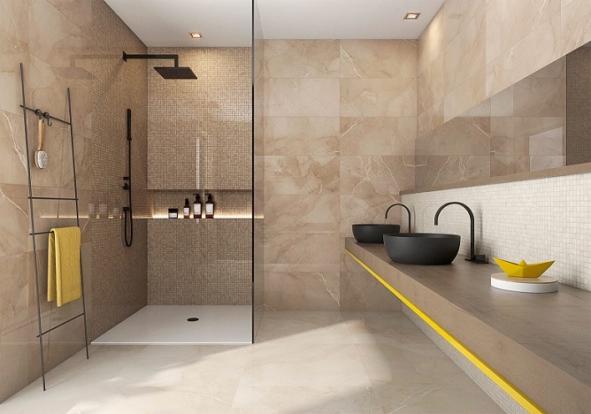 Soojades toonides puhas ja selgete joontega vannituba. Sisseehitatud nišid koos valgustusega lisavad eripära ning muudavad ruumi visuaalselt veelgi suuremaks. Samas on need ka käepärased kohad, kuhu asetada pesemisvahendid.