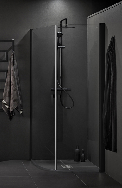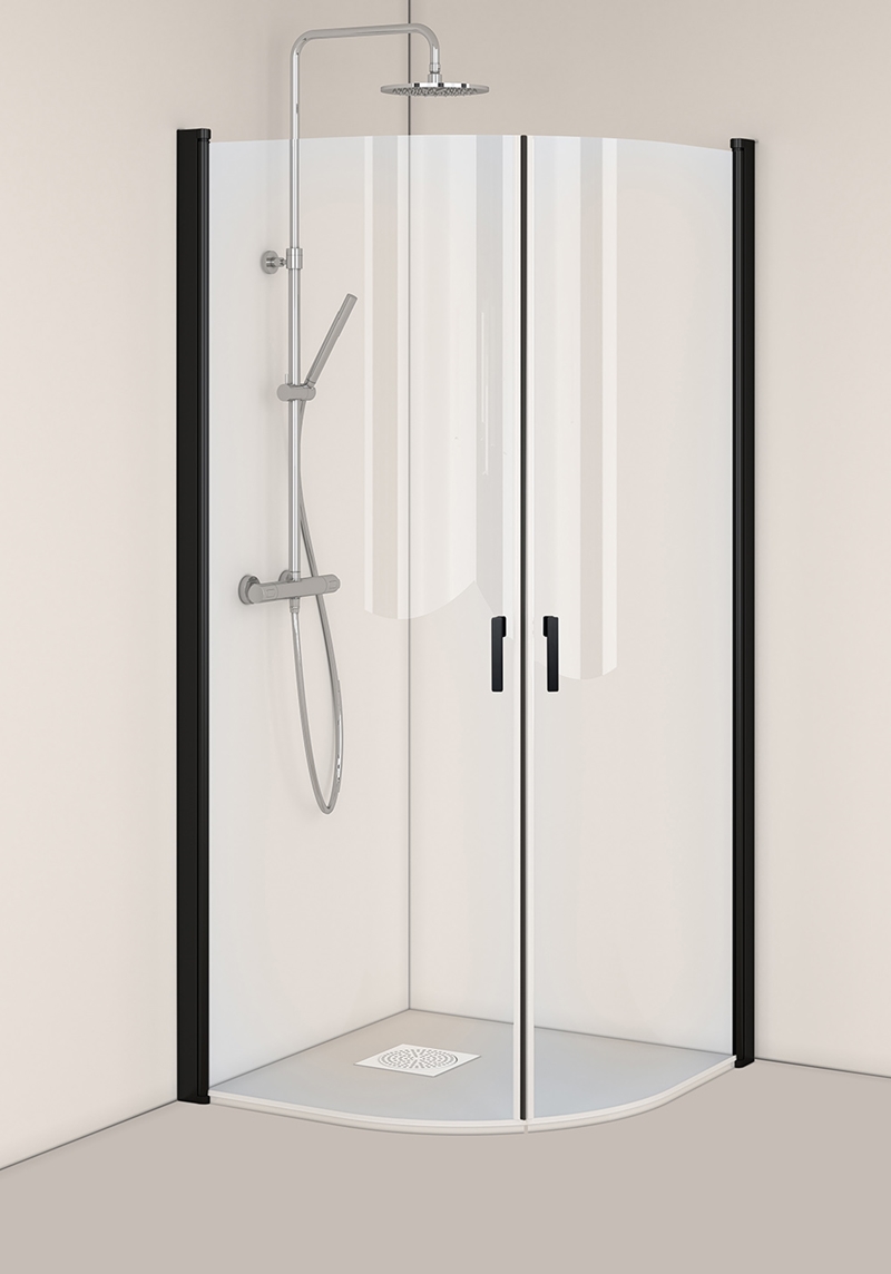 Stiilne mustade profiilidega dušinurk. Dušinurgal on 6 mm karastatud läbipaistev klaas ja alumiiniumprofiilid. Uksed avanevad nii sisse kui ka välja, mis muudab dušinurga ruumisäästlikuks. Hõlpsaks paigaldamiseks ja reguleerimiseks patenteeritud lahendus Hafa InstaQuick ™. Ustel on tõstehinged, tagamaks et need ei puudutaks avamisel põrandat.