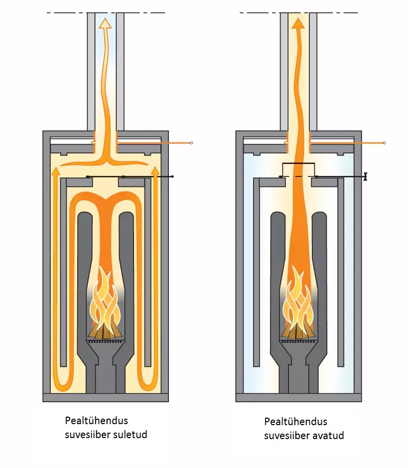 Tänu õhu sisselaskeavadele, mis asuvad kamina küttekolde tagaseinas on põlemisprotsess võrreldes teiste kaminatega palju efektiivsem. Seoses suurenenud hapniku peale vooluga kulub puitu kütmiseks vähem kuna see põleb küttekoldes efeketiivsemalt. Pideva hapniku peale vooluga põleb puit äärmiselt kõrgel temperatuuril, mis tagab suurema soojus hulga kahhelahjule.