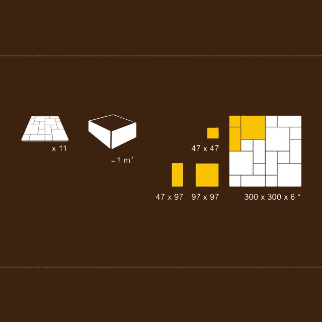 • Mõõtmed [mm]: plaat / detaili suurus: 300x300x6 / 47×47, 47×97, 97×97