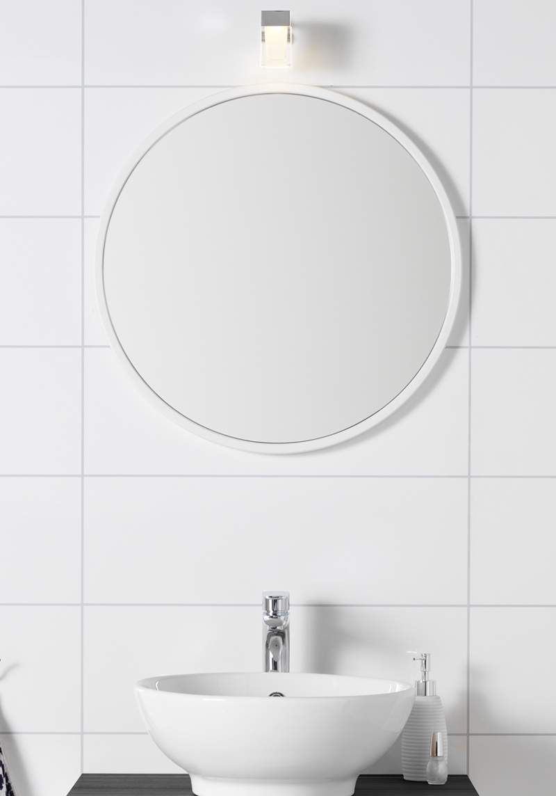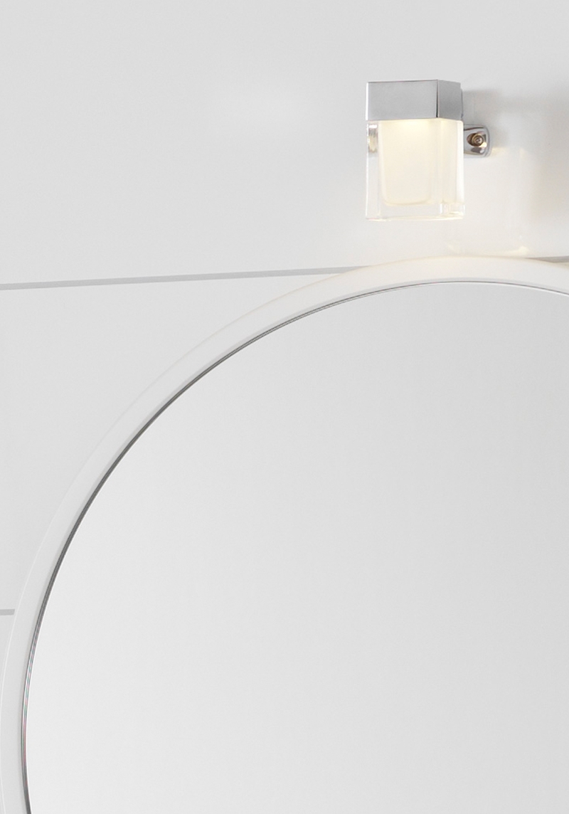 Kroomitud ja klaasist LED lamp, mis sobib hästi kokku ümmarguse Eden ja Go peeglitega.