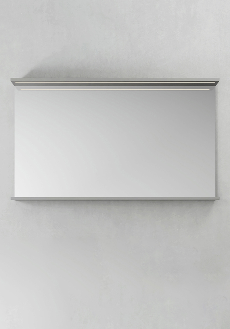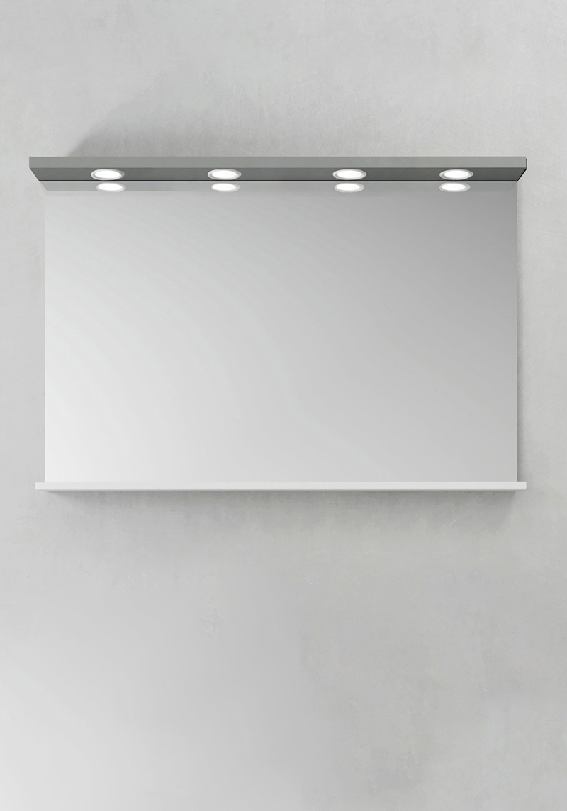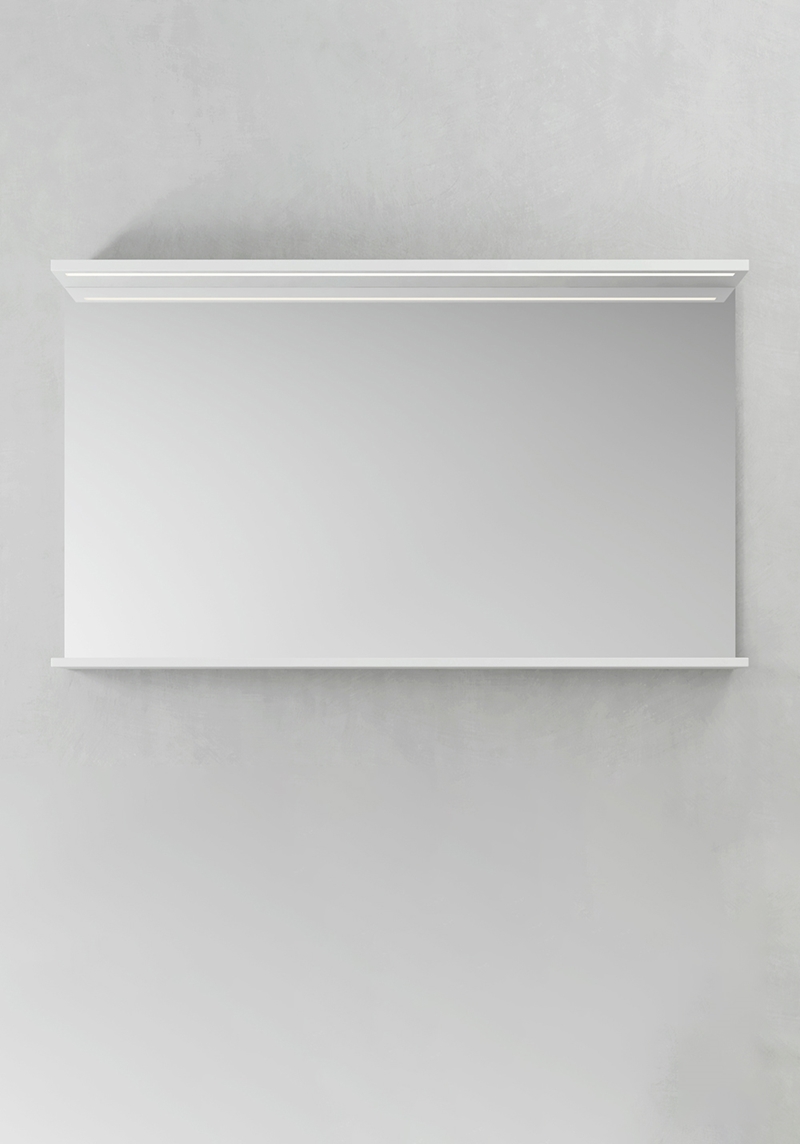 Peegel Store 1200 on funktsionaalse valgustusega – süvistatud LED valgusriba või neli kohtvalgustit-, mis toodavad sooja valget valgust. Praktiline riiul ladustamiseks.