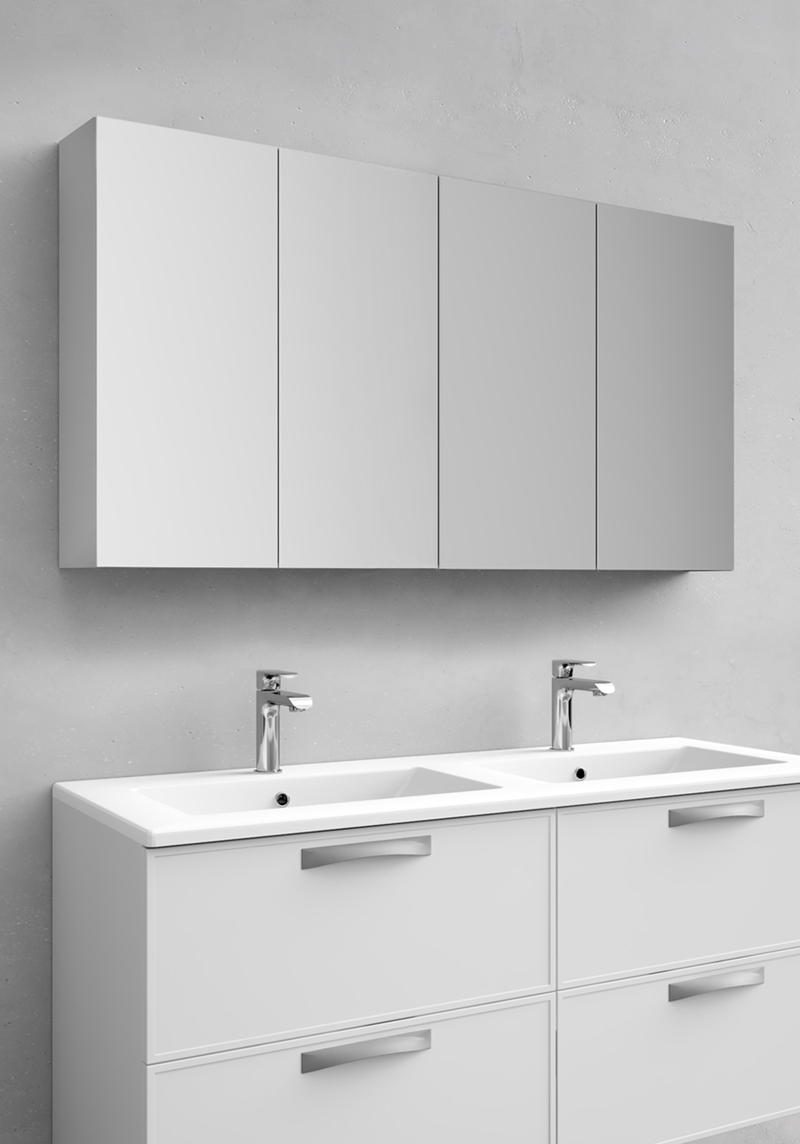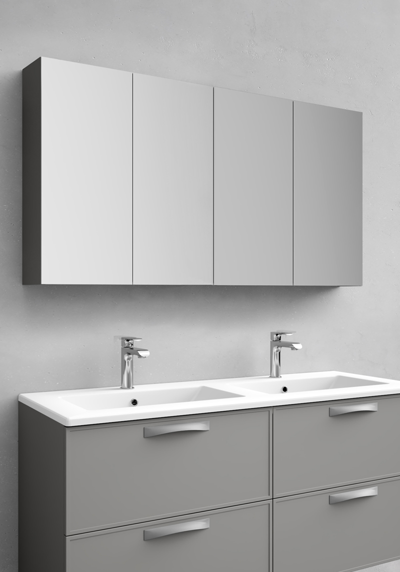 Peeglikapp Flex 1200, mis on saadaval kolmes värvis – valge, antratsiit ja hall. Kapil on peegel sees ja väljas ning klaasist riiulid. Uksed sulguvad vaikselt.