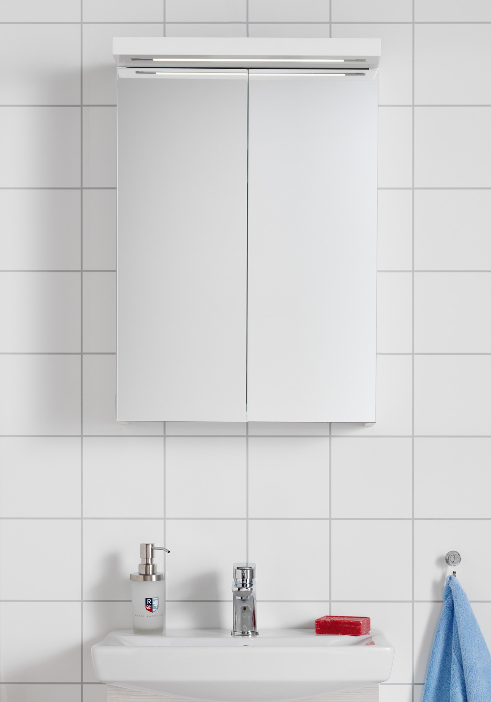 Life on valge klaasist reguleeritavate riiulitega peegelkapp. Süvistatud mugav LED-valgusti ja pistikupesa paremal küljel. Sobib kokku Life valamukapiga.