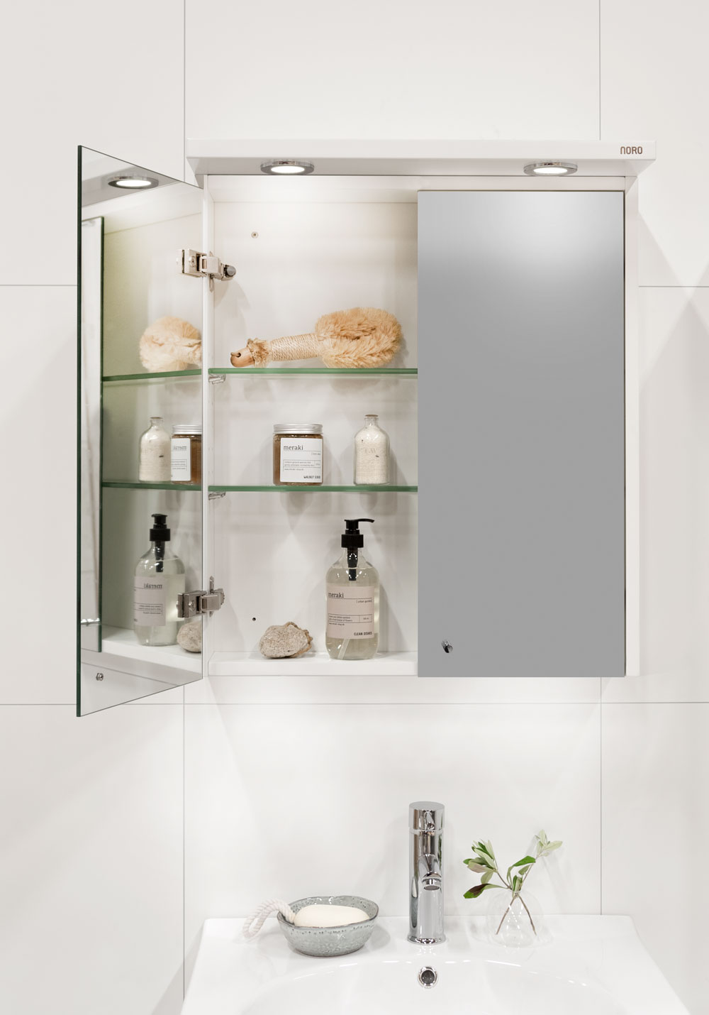 Noro valge peeglikapp polo 600. Kapil on valgustus ja 230V pistikupesa. Ustel “soft close” mehhanismid ning peeglid sees ja väljas. Riiulid läbipaistvast klaasist. Peeglikapp Polo sobib kokku vannitoamööbliga Polo.