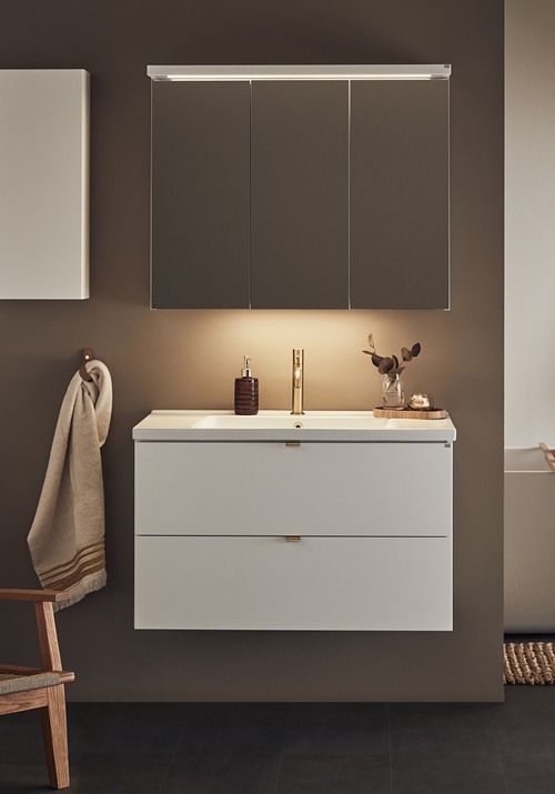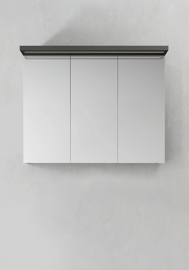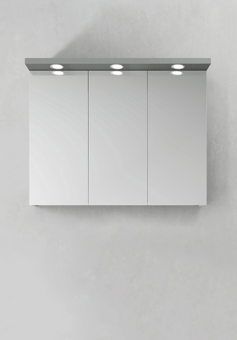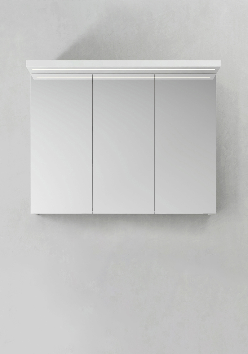 Peeglikapp Store 900, mis on saadaval erinevates värvides. Funktsionaalse valgustusega – süvistatud LED valgusriba või kolm kohtvalgustit-, mis annavad sooja valget valgust. Pehmelt (soft-close) sulguvad uksed, millel on peegel sees ja väljas. Kapi sees on paremal toitepistik. Turvalised liigutatavad klaasist riiulid.