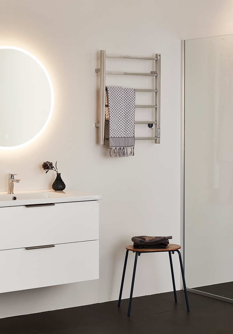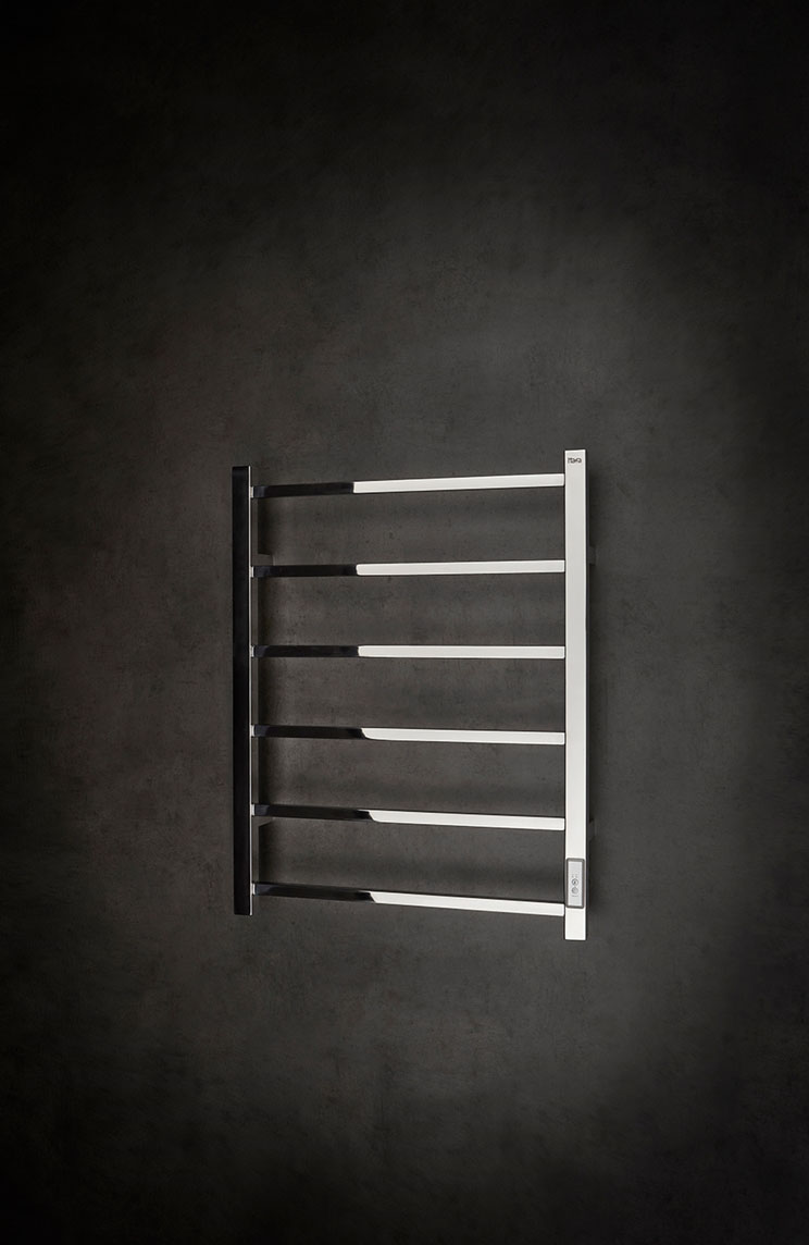 Minimalistlik kaasaegne sirgete torudega elektriline käterätikuivati, mis sobib enamiku vannitubadega. Sisseehitatud taimer aitab energiat säästa. Kui Te ei soovi toitejuhet näha, saab rätikusoojendi paigaldada varjatud elektriühendusega.
