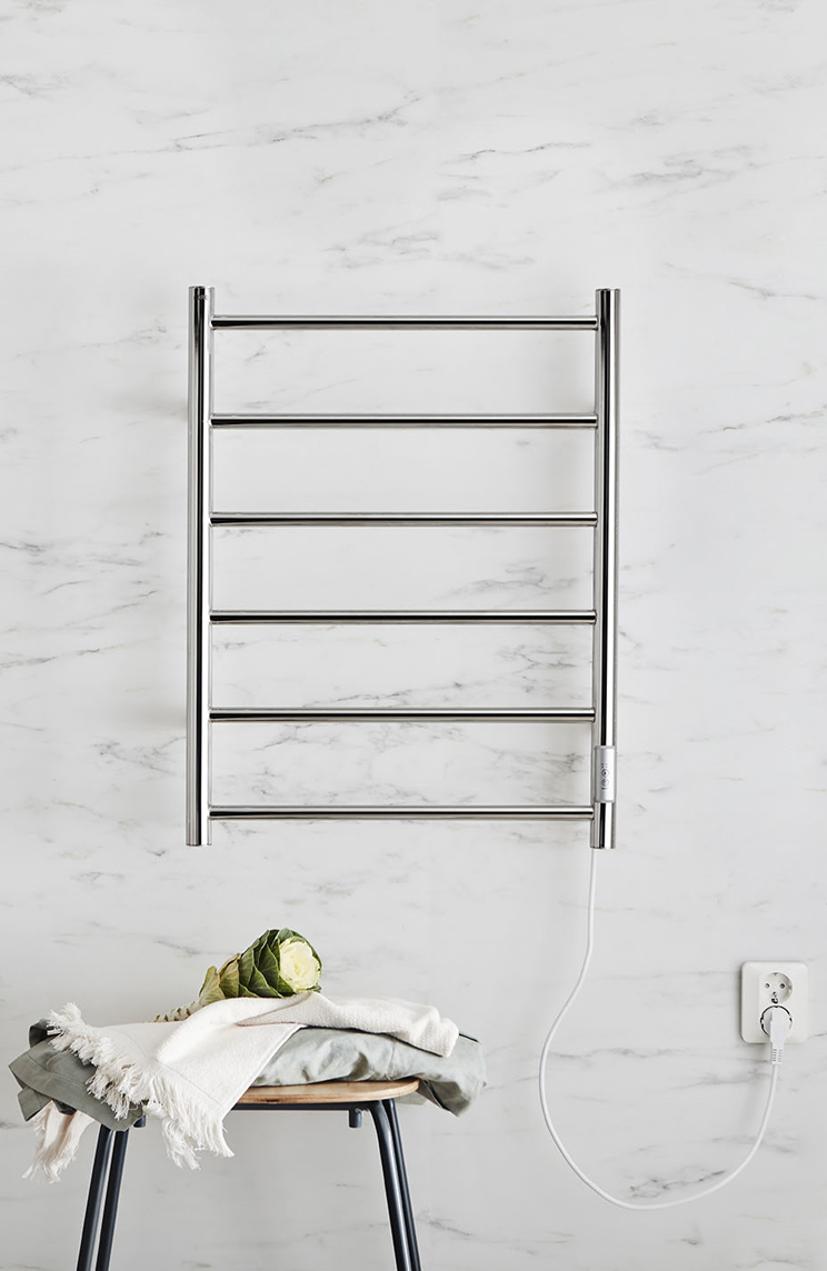 Väike funktsionaalne käterätikuivati, mis sobib ideaalselt nii traditsiooniliste kui ka moodsamate vannitubade sisustusse. Suurte vahedega torud pakuvad ruumi paljudele rätikutele ja sisseehitatud taimer vähendab elektritarbimist. Ühendage otse pistikupessa või elektriku abiga varjatult elektrivõrku. Toitekaabel ja pistik ei kuulu komplekti.