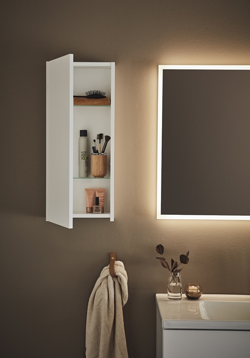 Väike seinakapp Store Side kahe klaasist riiuliga ja pehmelt sulguvate ustega. Viimaseid saab paigaldada paremale või vasakule. Kapi võib paigutada kõrgele või madalale, nt. tualeti kohal, mis on sageli raisatud ruum.