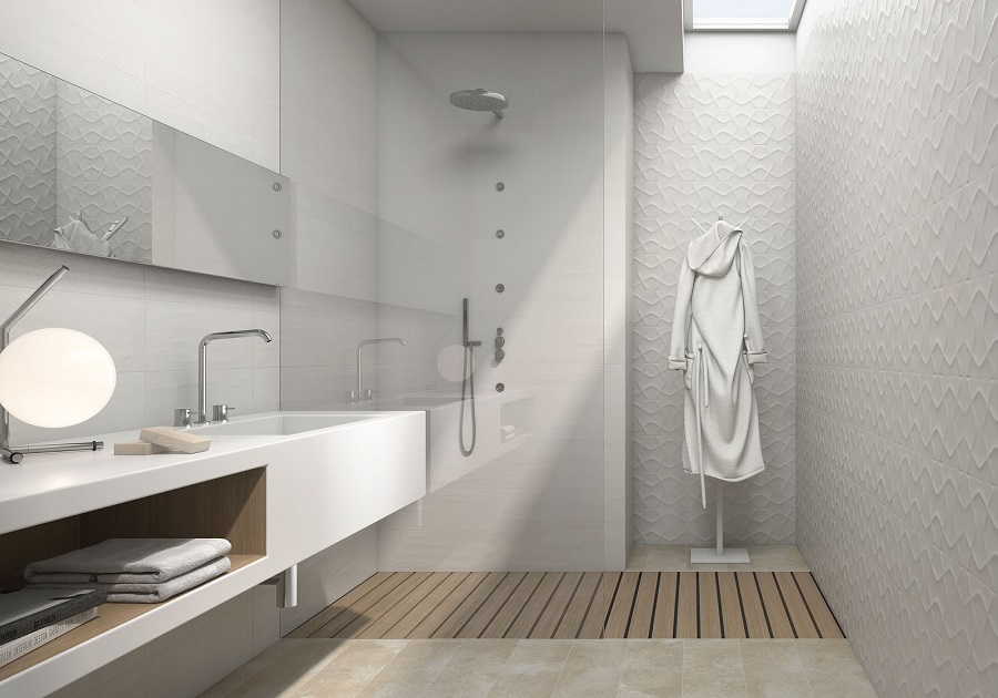 Satiin pinnaga õrnalt reljeefne valge seinaplaat, mida on lihtne kokku sobitada teiste sama seeria keraamiliste plaatidega.