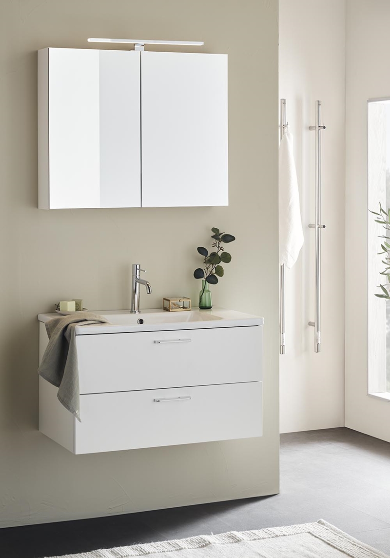 Komplektis on vastavas suuruses valamu Neo, millele on võimalik valida erinevat värvi äravoole. Valikus on erinevad käepidemed – hõbedased Felx ning mustad Arc. Mööbel kinnitatakse seina külge reguleeritavate riputusklambritega, mis tagavad hõlpsa ja kiire paigalduse.