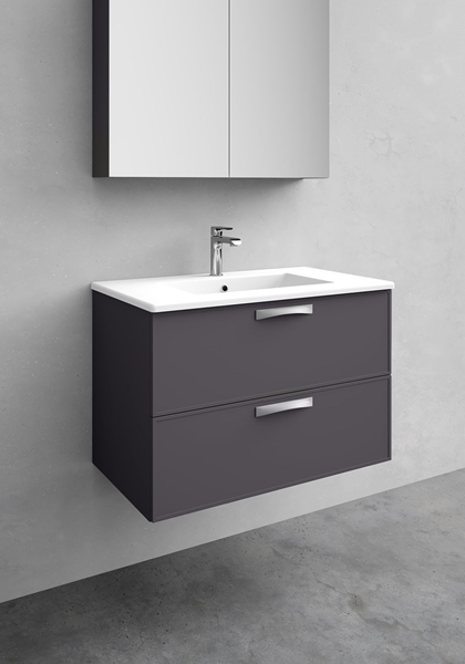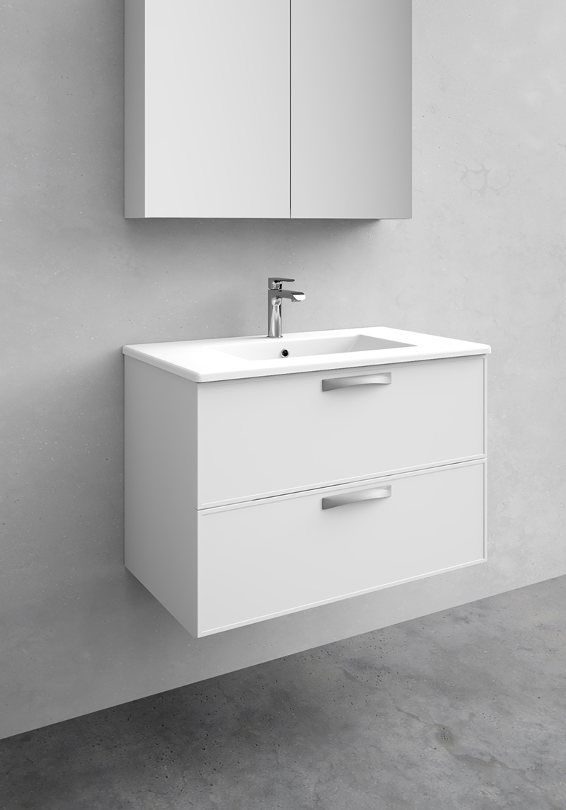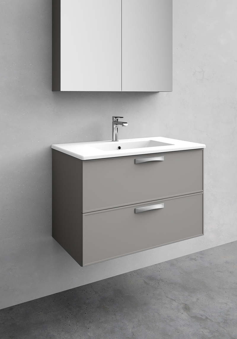 Noro Vogue 800 on Art Deco disainiga valamukapp, mis on saadaval kolmes viimistluses – valge matt, hall matt ja antratsiithall. Tänapäeva tehnoloogia on ühendatud eriliste detailidega, mis annavad mööblile elegantse välimuse. Kapi juurde saab valida uputatava valamu Attract (portselan või betoon) või erinevad tööpinnad. Uputatava valamuga komplektile on võimalik valida erinevat värvi äravoole. Tööpinnaga kapi juurde ei kuulu valamu – valige endale meelepärane pinnapealne valamu meie e-poest.