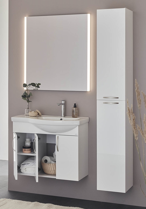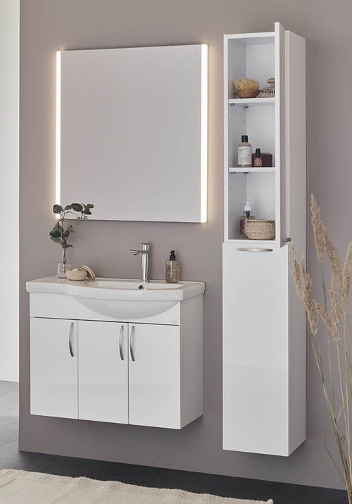 - Valamukapp on saadaval mati ja läikiva viimistlusega ning kahes laiuses. Kapp laiuses 750 mm on saadaval nii parema- kui ka vasakukäelisena, 550 mm laiusel kapil käelisus puudub.